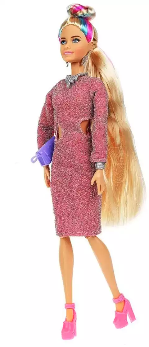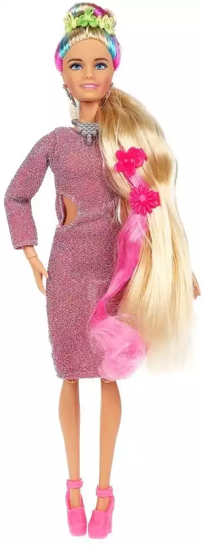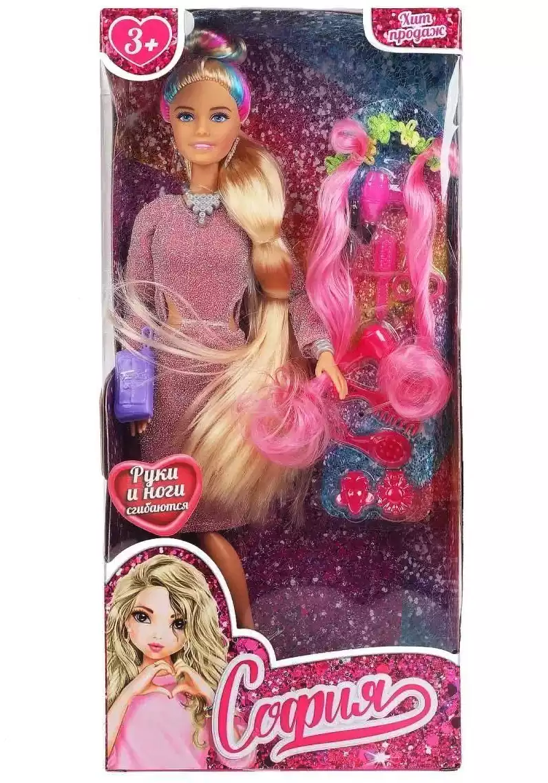 Модница София одета в стильное блестящее платье-миди розового цвета. Образ куколки дополняют элегантные серьги, колье и часы. Одежда и аксессуары легко снимаются и надеваются. С такой модной куклой девочке будет интересно и весело играть: благодаря тому, что руки и ноги куклы подвижны, им можно придать любое положение. У Софии очень длинные красивые волосы, которые хозяйка куклы сможет заплетать в разные причёски и украшать их розовыми прядями и заколками. Детально проработанный дизайн куклы вдохновит девочку на новые игровые сюжеты.