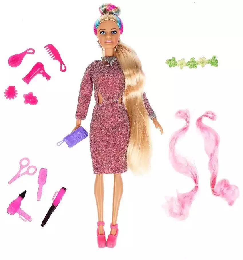 В комплекте идет кукла, сумочка и аксессуары для создания стильной причёски.
