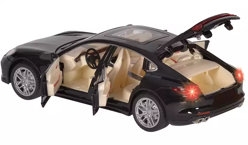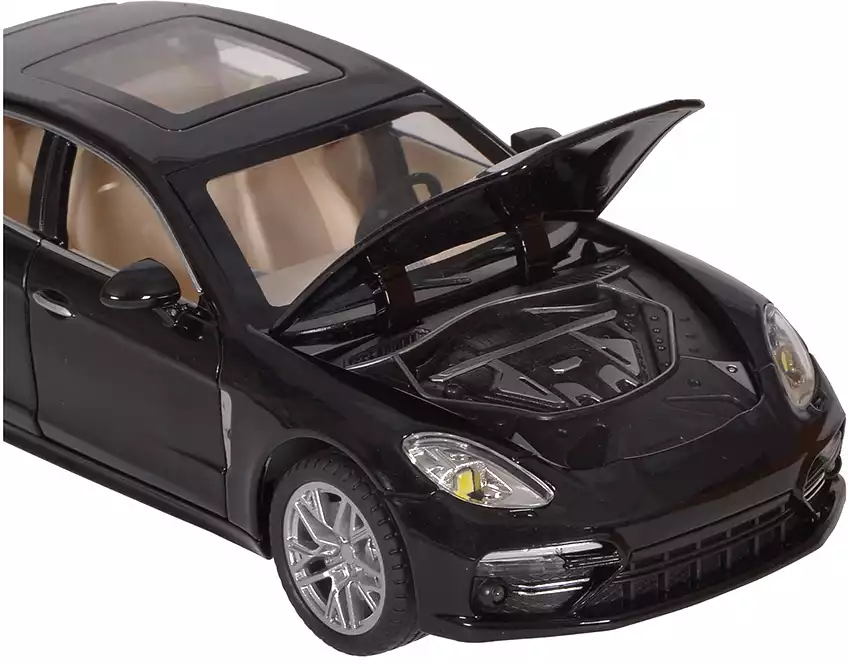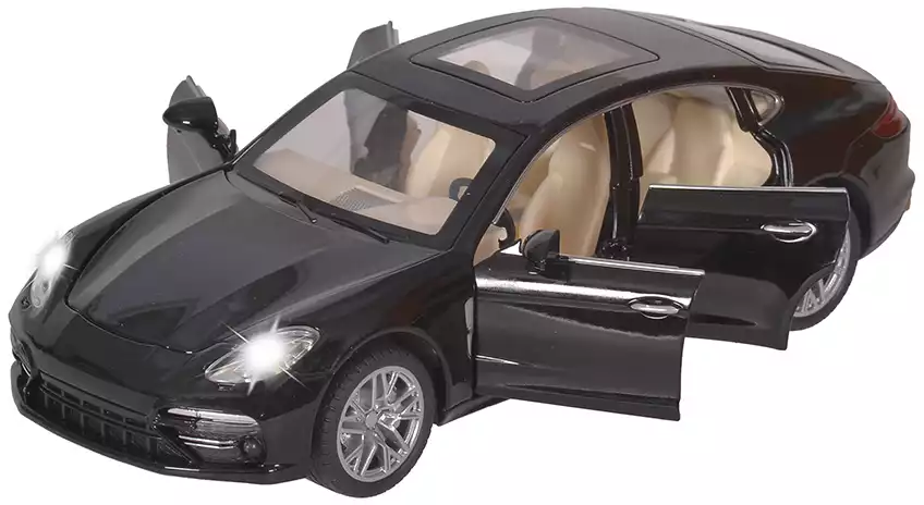 Масштабная (1:24) металлическая модель Porsche Panamera с световыми, звуковыми эффектами и инерционным механизмом. Открываются 4 двери, капот и багажник, складываются зеркала, поднимается полка багажника, вращаются руль и поворачивают колеса. Длина 18,5см.